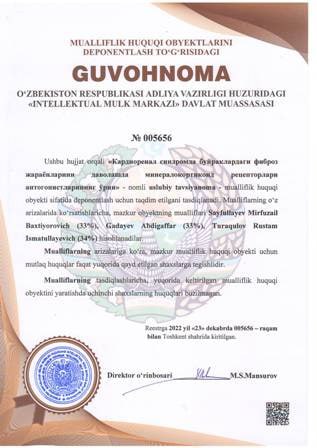 | 4444 | №005656 | Uslubiy tavsiyanoma - «Кардиоренал синдромда буйраклардаги фиброз жараёнларини даволашда минералокортикоид рецепторлари антогонистларининг ўрни» | Sayfullayev Mirfuzail Baxtiyorovich (33%), Gadayev Abdigaffar (33%), Turaqulov Rustam Ismatullayevich (34%) | Sayfullayev Mirfuzail Baxtiyorovich, Gadayev Abdigaffar, Turaqulov Rustam Ismatullayevich | 12/23/2022 | ![]() |