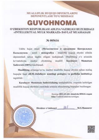 | 4483 | №005616 | Monografiya - "Метасоматизм и оруденение Центральных Кызылкумов" | Karabayev Mamatxan Sadirovich (100%) | H.M.Abdullayev nomidagi geologiya va geofizika instituti | 12/22/2022 | ![]() |