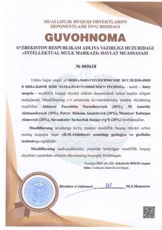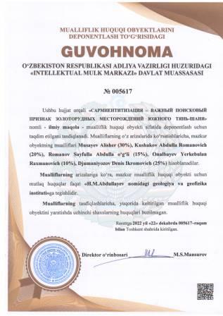 | 4482 | №005617 | Ilmiy maqola -"САРМИЕНТИТИЗАЦИЯ – ВАЖНЫЙ ПОИСКОВЫЙ ПРИЗНАК ЗОЛОТОРУДНЫХ МЕСТОРОЖДЕНИЙ ЮЖНОГО ТЯНЬ-ШАНЯ" | Musayev Alisher (30%), Kushakov Abdulla Romanovich (20%), Romanov Sayfulla Abdulla o‘g‘li (15%), Onalbayev Yerkebulan Raxmanovich (10%), Djumaniyozov Denis Ikromovich (25%) | H.M.Abdullayev nomidagi geologiya va geofizika instituti | 12/22/2022 | ![]() |