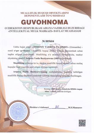 | 4495 | №005604 | O‘quv qo‘llanma - «Jismoniy tarbiya va sport» | Aripova Vasila Baxtiyarovna (100%) | Aripova Vasila Baxtiyarovna | 12/21/2022 | ![]() |