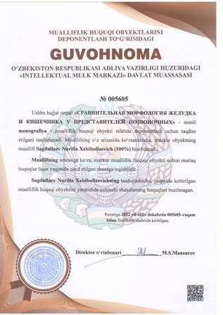 | 4494 | №005605 | Monografiya - «Сравнительная морфология желудка и кишечника у представителей позвоночных» | Sagdullayev Nurilla Xabibullayevich (100%) | Sagdullayev Nurilla Xabibullayevich | 12/21/2022 | ![]() |