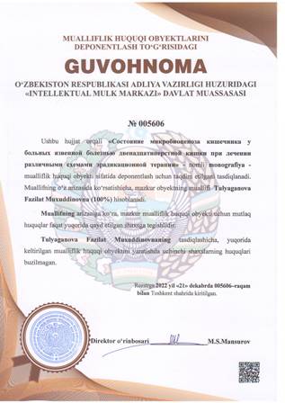 | 4493 | №005606 | Monografiya - «Состояние микробиоценоза кишечника у больных язвенной болезнью двенадцатиперстной кишки при лечении различными схемами эрадикационной терапии» | Tulyaganova Fazilat Muxuddinovna (100%) | Tulyaganova Fazilat Muxuddinovna | 12/21/2022 | ![]() |