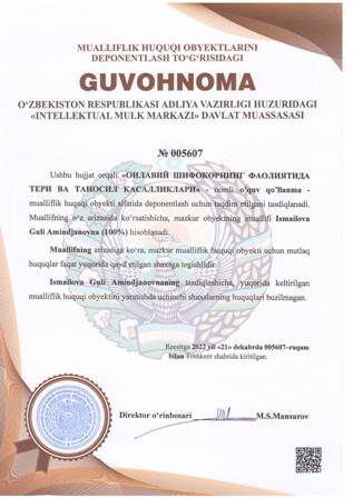 | 4496 | №005603 | Monografiya - «Озиқ-овқат маҳсулотларидан гмо таркибли соя унининг тажрибавий ва илмий баҳолаш» | Sobirova Dildora Ravshanovna (100%) | Sobirova Dildora Ravshanovna | 12/21/2022 | ![]() |