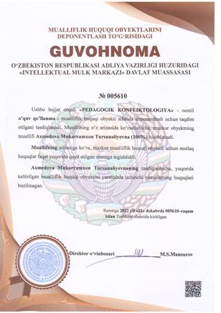 | 4489 | №005610 | O’quv qo’llanma - «Pedagogik konfliktologiya» | Axmedova Mukarramxon Tursunaliyevna (100%) | Axmedova Mukarramxon Tursunaliyevna | 12/21/2022 | ![]() |