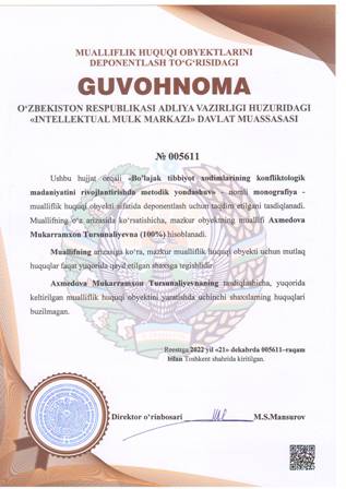 | 4488 | №005611 | Monografiya - «Bo’lajak tibbiyot xodimlarining konfliktologik madaniyatini rivojlantirishda metodik yondashuv» | Axmedova Mukarramxon Tursunaliyevna (100%) | Axmedova Mukarramxon Tursunaliyevna | 12/21/2022 | ![]() |