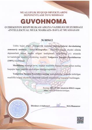 | 4487 | №005612 | Monografiya - «Terapevtik rezistent depressiyalarni davolashning zamonaviy usullari» | Yadgarova Nargiza Faxritdinovna (100%) | Yadgarova Nargiza Faxritdinovna | 12/21/2022 | ![]() |