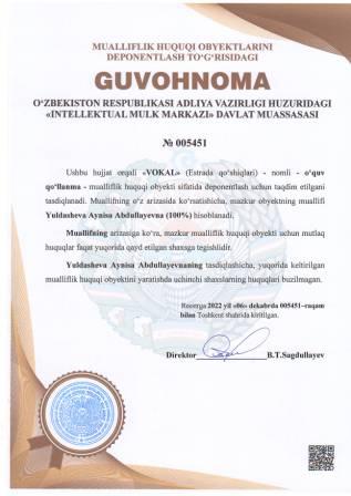 | 4648 | №005451 | O‘quv qo‘llanma - "VOKAL" (Estrada qo‘shiqlari) | Yuldasheva Aynisa Abdullayevna (100%) | Yuldasheva Aynisa Abdullayevna | 12/06/2022 | ![]() |