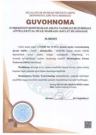 | 4646 | №005453 | Monografiya - "ТОҲИР ВА ЗУХРА" dostoni turkiy versiyalarining qiyosiy tahlili | Mamatqulova Feruza Toxirovna (100%) | Mamatqulova Feruza Toxirovna (100%) | 12/06/2022 | ![]() |