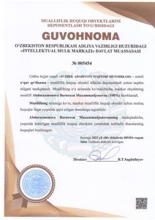 | 4645 | №005454 | O‘quv qo‘llanma - "O‘ZBEK ADABIYOTI O‘QITISH METODIKASI" | Abduraxmonova Barnoxon Muxammadjonovna (100%) | Abduraxmonova Barnoxon Muxammadjonovna | 12/06/2022 | ![]() |