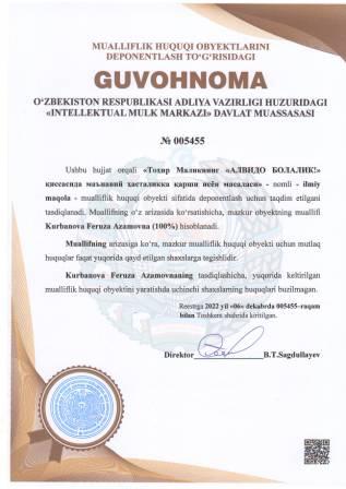 | 4644 | №005455 | Ilmiy maqola -"Тоҳир Маликнинг "АЛВИДО БОЛАЛИК!" қиссасида маънавий ҳасталикка қарши исён масаласи" | Kurbanova Feruza Azamovna (100%) | Kurbanova Feruza Azamovna | 12/06/2022 | ![]() |