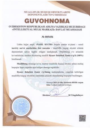 | 4643 | №005456 | Tasviriy san’at asarlaridan foto nusxalar-"NASIL KUCHI" dviptix asarlar to‘plami | Ilyasov Bolatbek Zamir o‘g‘li (100%) | Ilyasov Bolatbek Zamir o‘g‘li | 12/06/2022 | ![]() |