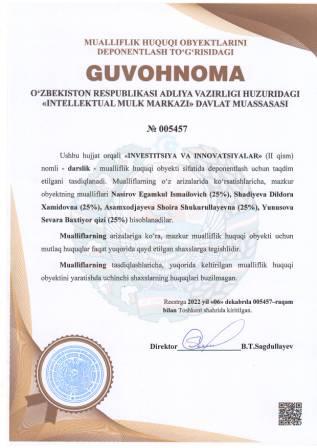 | 4642 | №005457 | Darslik - "INVESTITSIYA VA INNOVATSIYALAR" (II qism) | Nasirov Egamkul Ismailovich (25%), Shadiyeva Dildora Xamidovna (25%), Asamxodjayeva Shoira Shukurullayevna (25%), Yunusova Sevara Baxtiyor qizi (25%) | Nasirov Egamkul Ismailovich, Shadiyeva Dildora Xamidovna, Asamxodjayeva Shoira Shukurullayevna, Yunusova Sevara Baxtiyor qizi | 12/06/2022 | ![]() |