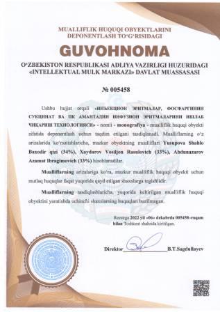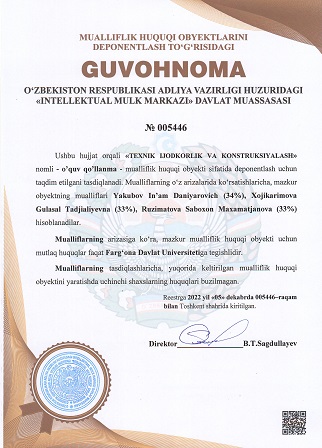 | 4653 | №005446 | O’quv qo’llanma - «Texnik ijodkorlik va konstruksiyalash» | Yakubov In’am Daniyarovich (34%), Xojikarimova Gulasal Tadjialiyevna (33%), Ruzimatova Saboxon Maxamatjanova (33%) | Farg‘ona Davlat Universiteti | 12/05/2022 | ![]() |