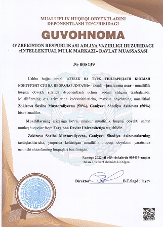 | 4660 | №005439 | Jamlanma asar - «Ўзбек ва турк тилларидаги қисман конгруэнт сўз ва иборалар луғати» | Zokirova Soxiba Muxtoraliyevna (50%), Ganiyeva Shodiya Azizovna (50%) | Farg‘ona Davlat Universiteti | 12/05/2022 | ![]() |