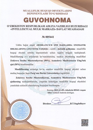 | 4658 | №005441 | Metodik qollanma - «Boshlang‘ich sinf darslarida onomastik birliklarning lingvistik tadqiqi» | Zokirova Soxiba Muxtoraliyevna (50%), Axmedova Mashxuraxon Ulug‘bek qizi (50%) | Farg‘ona Davlat Universiteti | 12/05/2022 | ![]() |