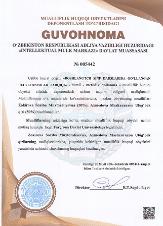 | 4657 | №005442 | Metodik qollanma - «Boshlang‘ich sinf darslarida qo‘llangan relyefonimlar tadqiqi» | Zokirova Soxiba Muxtoraliyevna (50%), Axmedova Mashxuraxon Ulug‘bek qizi (50%) | Farg‘ona Davlat Universiteti | 12/05/2022 | ![]() |