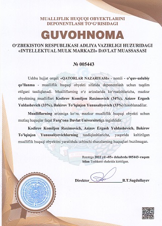 | 4656 | №005443 | O’quv-uslubiy qo’llanma - «Qatorlar nazariyasi» | Kodirov Komiljon Raximovich (34%), Azizov Ergash Yuldashevich (33%), Bakirov To’lqinjon Yunusaliyevich (33%) | Farg‘ona Davlat Universiteti | 12/05/2022 | ![]() |