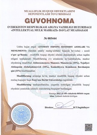 | 4655 | №005444 | O’quv qo’llanma - «Ijtimoiy ishning iqtisodiy asoslari va menejmenti» (fanidan amaliy mashg’ulotlarni bajarish bo’yicha) | Abduraxmonova Manzura Manatovna (33%), Tojaliyev Abduqosim Abdulxakimovich (34%), Xonkeldiyeva Komilaxon Ravshanjon qizi (33%) | Farg‘ona Davlat Universiteti | 12/05/2022 | ![]() |