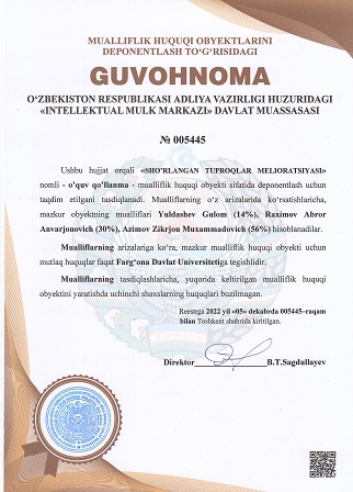 | 4654 | №005445 | O’quv qo’llanma - «Sho’rlangan tuproqlar melioratsiyasi» | Yuldashev Gulom (14%), Raximov Abror Anvarjonovich (30%), Azimov Zikrjon Muxammadovich (56%) | Farg‘ona Davlat Universiteti | 12/05/2022 | ![]() |