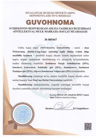 | 4652 | №005447 | Jean Websterning «Daddy-Long-Legs» asarining ingliz tilidan o‘zbek tiliga mualliflik tarjimasi - «Novchagina dadajonim» | Xoshimova Nargis Abdullayevna (25%), Ismoilova Gulyoraxon Xabibullo qizi (25%), Saminjonova Saodatxon Nozimjon qizi (25%), Aliyeva Sanobarxon Valijon qizi (25%) | Farg‘ona Davlat Universiteti | 12/05/2022 | ![]() |