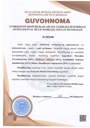 | 4651 | №005448 | O’quv qo’llanma - «Dorivor o‘simliklar biologiyasi va ekologiyasi» | Isag‘aliyev Murodjon To‘ychiboyevich (25%), Meliboyev Sobirjon (25%), Isomiddinov Zokirjon Jaloldinovich (25%), Obidov Muzaffarjon Valijonovich (25%) | Farg‘ona Davlat Universiteti | 12/05/2022 | ![]() |