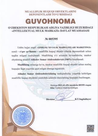 | 4704 | №005395 | O‘quv qo‘llanma - "QISHLOQ XO‘JALIK MAHSULOTLARI MARKETINGI" | Alikulov Samar Abdirashidovich (100%) | Alikulov Samar Abdirashidovich | 11/29/2022 | ![]() |