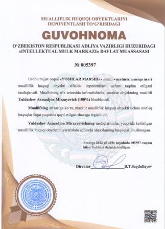 | 4702 | №005397 | Matnsiz musiqa asari - "YOSHLAR MARSHI" | Yuldashev Axmadjon Mirzayevich (100%) | Yuldashev Axmadjon Mirzayevich | 11/29/2022 | ![]() |