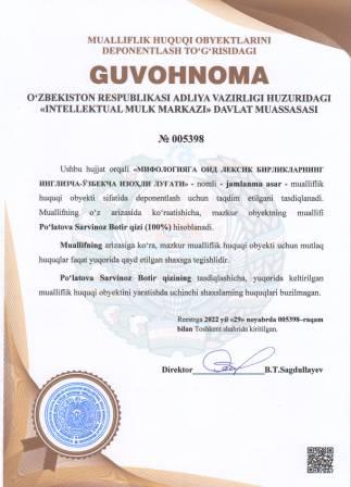 | 4701 | №005398 | Jamlanma asar - "МИФОЛОГИЯГА ОИД ЛЕКСИК БИРЛИКЛАРНИНГ ИНГЛИЗЧА-ЎЗБЕКЧА ИЗОҲЛИ ЛУҒАТИ" | Po‘latova Sarvinoz Botir qizi (100%) | Po‘latova Sarvinoz Botir qizi | 11/29/2022 | ![]() |