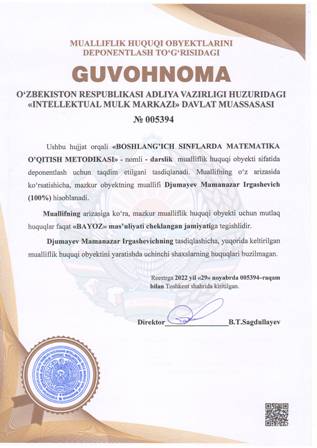 | 4705 | №005394 | Darslik - «BOSHLANG’ICH SINFLARDA MATEMATIKA O’QITISH METODIKASI» | Djumayev Mamanazar Irgashevich (100%) | Djumayev Mamanazar Irgashevich | 11/29/2022 | ![]() |