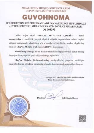 | 4706 | №005393 | Monografiya - «АРАСТУ АНГЛАТГАН АДАБИЁТ» | Ulug’ov Abdulla O’zbekovich (100%) | Ulug’ov Abdulla O’zbekovich | 11/29/2022 | ![]() |