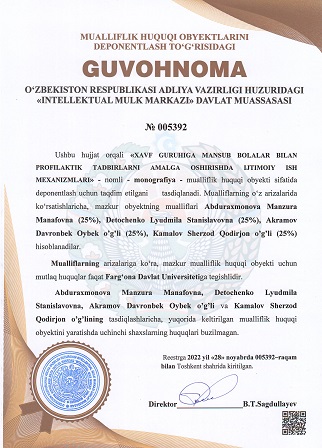 | 4707 | №005392 | Monografiya - «Xavf guruhiga mansub bolalar bilan profilaktik tadbirlarni amalga oshirishda ijtimoiy ish mexanizmlari» | Abduraxmonova Manzura Manafovna (25%), Detochenko Lyudmila Stanislavovna (25%), Akramov Davronbek Oybek o’g’li (25%), Kamalov Sherzod Qodirjon o’g’li (25%) | Farg‘ona Davlat Universiteti | 11/28/2022 | ![]() |