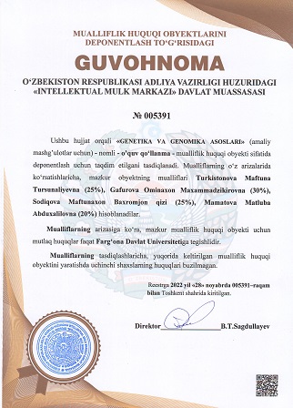 | 4708 | №005391 | O’quv qo‘llanma - «Genetika va genomika asoslari» (amaliy mashg’ulotlar uchun) | Turkistonova Maftuna Tursunaliyevna (25%), Gafurova Ominaxon Maxammadzikirovna (30%), Sodiqova Maftunaxon Baxromjon qizi (25%), Mamatova Matluba Abduxalilovna (20%) | Farg‘ona Davlat Universiteti | 11/28/2022 | ![]() |