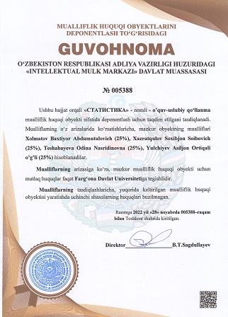 | 4711 | №005388 | O’quv-uslubiy qo‘llanma - «Статистика» | Xolmatov Baxtiyor Abdumutalovich (25%), Xazratqulov Soxibjon Soibovich (25%), Teshabayeva Odina Nasridinovna (25%), Yulchiyev Asiljon Ortiqali o’g’li (25%) | Farg‘ona Davlat Universiteti | 11/28/2022 | ![]() |