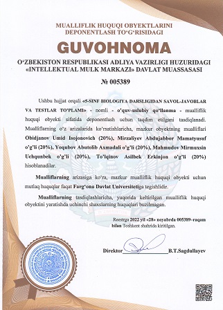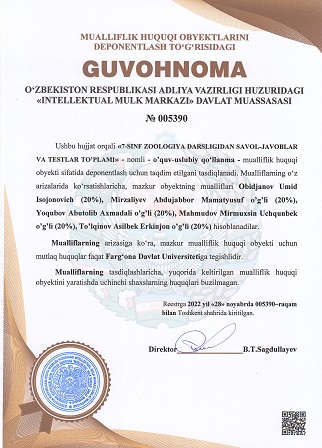 | 4710 | №005389 | O’quv-uslubiy qo‘llanma - «5-sinf biologiya darsligidan savol-javoblar va testlar to’plami» | Obidjanov Umid Isojonovich (20%), Mirzaliyev Abdujabbor Mamatyusuf o’g’li (20%), Yoqubov Abutolib Axmadali o’g’li (20%), Mahmudov Mirmuxsin Uchqunbek o’g’li (20%), To’lqinov Asilbek Erkinjon o’g’li (20%) | Farg‘ona Davlat Universiteti | 11/28/2022 | ![]() |