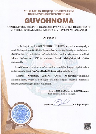 | 4718 | №005381 | Monografiya - «Коррупция - иллат» | Sobirov Ne‘matjan (50%), Akbarov Oybek Abdug‘afurovich (50%) | Farg‘ona Davlat Universiteti | 11/28/2022 | ![]() |