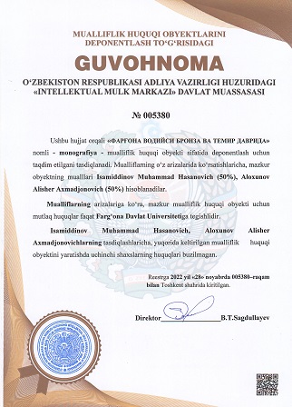 | 4719 | №005380 | Monografiya - «Фарғона водийси бронза ва темир даврида» | Isamiddinov Muhammad Hasanovich (50%), Aloxunov Alisher Axmadjonovich (50%) | Farg‘ona Davlat Universiteti | 11/28/2022 | ![]() |