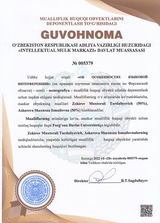 | 4720 | №005379 | Monografiya - «Об особенностях языковой интерференции» (на примере изучения немецкого языка по Ферганской области) | Zokirov Muxtorali Turdaliyevich (50%), Askarova Shaxnoza Ismailovna (50%) | Farg‘ona Davlat Universiteti | 11/28/2022 | ![]() |