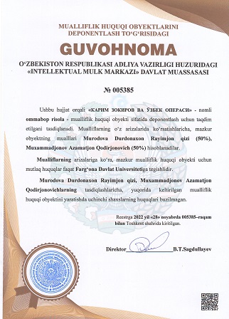 | 4714 | №005385 | Ommabop risola - «Карим Зокиров ва ўзбек операси» | Murodova Durdonaxon Rayimjon qizi (50%), Muxammadjonov Azamatjon Qodirjonovich (50%) | Farg‘ona Davlat Universiteti | 11/28/2022 | ![]() |