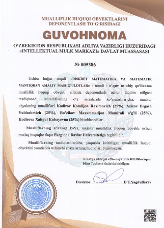 | 4713 | №005386 | O’quv uslubiy qo‘llanma - «Diskret matematika va matematik mantiqdan amaliy mashg’ulotlar» | Kodirov Komiljon Raximovich (25%), Azizov Ergash Yuldashevich (25%), Ro’zikov Maxammadjon Mamirali o’g’li (25%), Kodirova Xaitgul Kubayevna (25%) | Farg‘ona Davlat Universiteti | 11/28/2022 | ![]() |