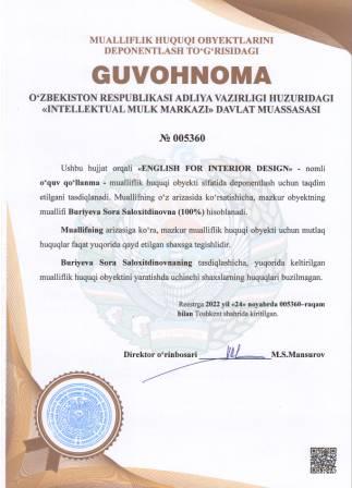 | 4739 | №005360 | O‘quv qo‘llanma - ENGLISH FOR INTERIOR DESIGN" | Buriyeva Sora Saloxitdinovna (100%) | Buriyeva Sora Saloxitdinovna | 11/24/2022 | ![]() |