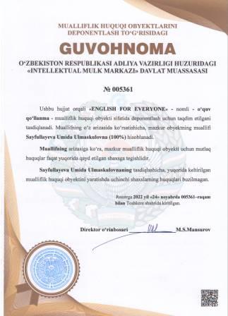 | 4738 | №005361 | O‘quv qo‘llanma - "ENGLISH FOR EVERYONE" | Sayfullayeva Umida Ulmaskulovna (100%) | Sayfullayeva Umida Ulmaskulovna | 11/24/2022 | ![]() |