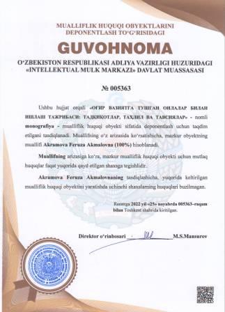 | 4736 | №005363 | Monografiya - "ОҒИР ВАЗИЯТГА ТУШГАН ОИЛАЛАР БИЛАН ИШЛАШ ТАЖРИБАСИ: ТАДҚИҚОТЛАР, ТАҲЛИЛ ВА ТАВСИЯЛАР" | Akramova Feruza Akmalovna (100%) | Akramova Feruza Akmalovna | 11/25/2022 | ![]() |
