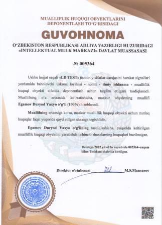 | 4735 | №005364 | Ilmiy ishlanma - "LD TEST" jismoniy sifatlar darajasini harakat signallari yordamida baholovchi uskuna loyihasi | Egamov Duryod Yaxyo o‘g‘li (100%) | Egamov Duryod Yaxyo o‘g‘li | 11/25/2022 | ![]() |