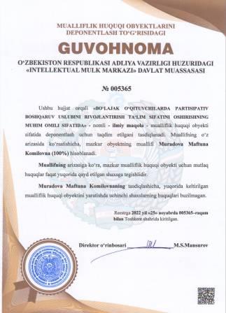 | 4734 | №005365 | Ilmiy maqola -"BO‘LAJAK O‘QITUVCHILARDA PARTISIPATIV BOSHQARUV USLUBINI RIVOJLANTIRISH TA‘LIM SIFATINI OSHIRISHNING MUHIM OMILI SIFATIDA" | Muradova Maftuna Komilovna (100%) | Muradova Maftuna Komilovna | 11/25/2022 | ![]() |