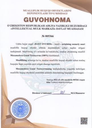 | 4733 | №005366 | Serialning ssenariy asari - "BAXT OVCHISI" | Muxamedova Guzal Tuxtayevna (100%) | Muxamedova Guzal Tuxtayevna | 11/25/2022 | ![]() |