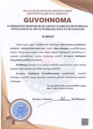 | 4732 | №005367 | Ilmiy ishlanma - "ZAMONAVIY PEDAGOG IMIJI SHAKLLANISHINING IJTIMOIY – PSIXOLOGIK OMILLARI" | Jo‘rayeva Sohibjamol Norqobilovna (100%) | Jo‘rayeva Sohibjamol Norqobilovna | 11/25/2022 | ![]() |