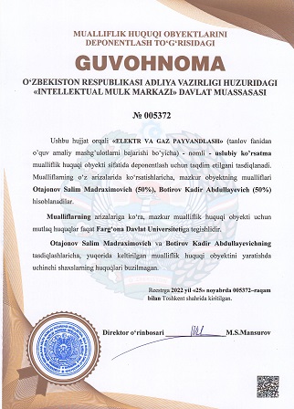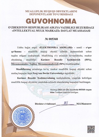 | 4731 | №005368 | O‘quv qo‘llanma - «Elektronika asoslari» | Karimov Boxodir Xoshimovich (50%), Mirzamaxmudov Tojiboy Mirzamaxmudovich (50%) | Farg‘ona Davlat Universiteti | 11/25/2022 | ![]() |