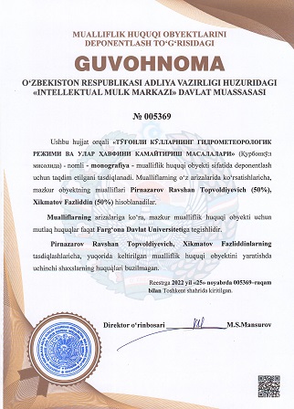 | 4730 | №005369 | Monografiya - «Tўғонли кўлларнинг гидрометеорологик режими ва улар ҳавфини камайтириш масалалари» (Қурбонкўл мисолида) | Pirnazarov Ravshan Topvoldiyevich (50%), Xikmatov Fazliddin (50%) | Farg‘ona Davlat Universiteti | 11/25/2022 | ![]() |