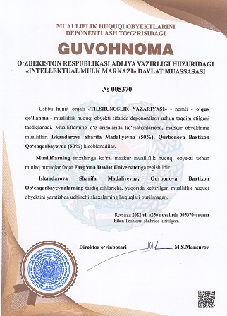 | 4729 | №005370 | O‘quv qo‘llanma - «Tilshunoslik nazariyasi» | Iskandarova Sharifa Madaliyevna (50%), Qurbonova Baxtixon Qo‘chqarbayevna (50%) | Farg‘ona Davlat Universiteti | 11/25/2022 | ![]() |