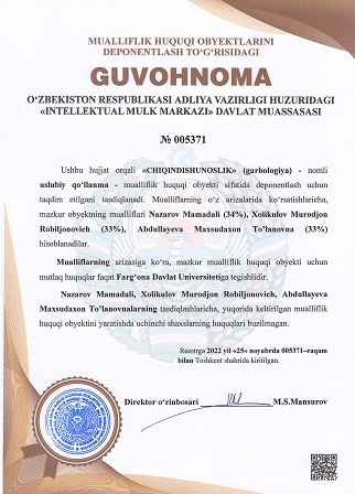 | 4728 | №005371 | Uslubiy qo‘llanma - «Chiqindishunoslik» (garbologiya) | Nazarov Mamadali (34%), Xolikulov Murodjon Robiljonovich (33%), Abdullayeva Maxsudaxon To’lanovna (33%) | Farg‘ona Davlat Universiteti | 11/25/2022 | ![]() |